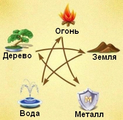 Получилась пентаграмма, где вода тушит огонь, огонь расплавляет металл, металл рубит дерево, дерево истощает землю, а земля поглощает воду.